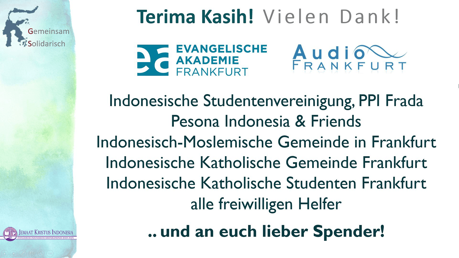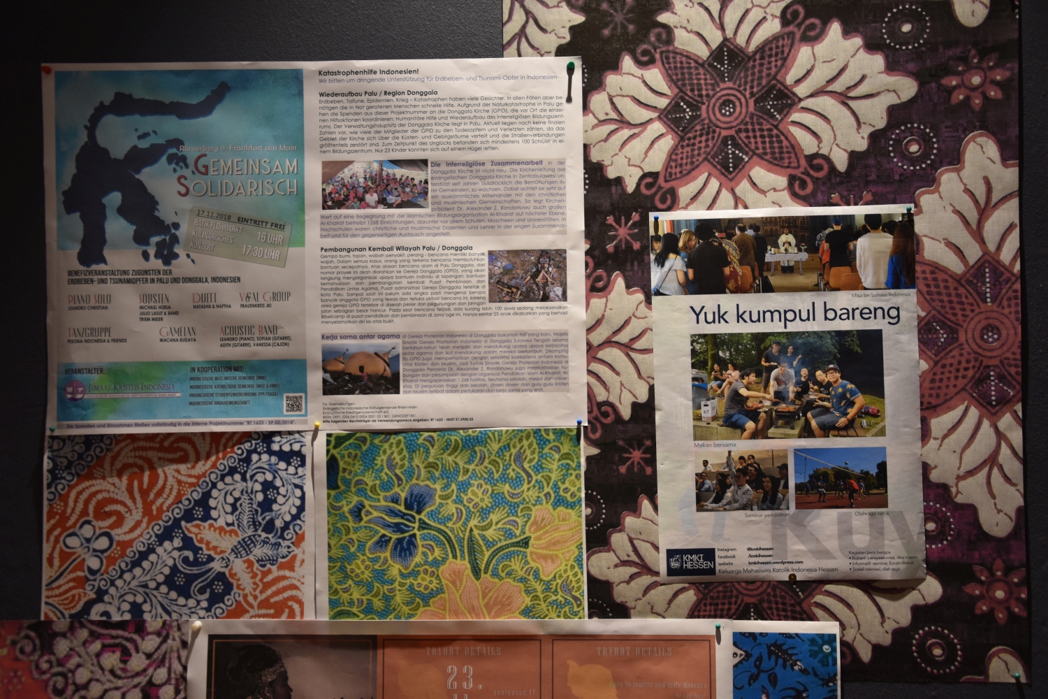 Projek ini diprakarsai oleh orang-orang muda kita. Malam Dana ini telah diselenggarakan pada hari Sabtu 2018/11/17 untuk korban bencana alam di Palu Donggala. Berawal dari Indonesia Care Day, sekarang telah menghasilkan satu proyek jangka panjang yaitu "Solidaritas Bersama". Mahasiswa-Mahasiswi dan orang-orang tua dalam dialog antaragama dengan teman-teman dan mitra, diantaranya Masyarakat Muslim Indonesia, Masyarakat Katolik Indonesia di Frankfurt dan di Hessen, Persatuan Pelajar Indonesia dan Masyarakat Hindu Indonesia telah menyelenggarakan Basar melalui pengjualan Batik, penjualan makanan khas Indonesia dan workshop angklung. Acara ini diselenggarakan di Akademi Evangelis di Frankfurt dengan didukung peralatan teknis dari Audio Frankfurt. Acara yang indah dan harmonis ini dikerjakan hanya dalam jangka waktu persiapan satu bulan saja. Sumbangan terkumpul pada malam amal tersebut sebesar 4,270.10 EURO, ditambahkan dengan sumbangan sebelumnya yang telah dikumpul, keseluruhan berjumlah 7,533.89 EURO.